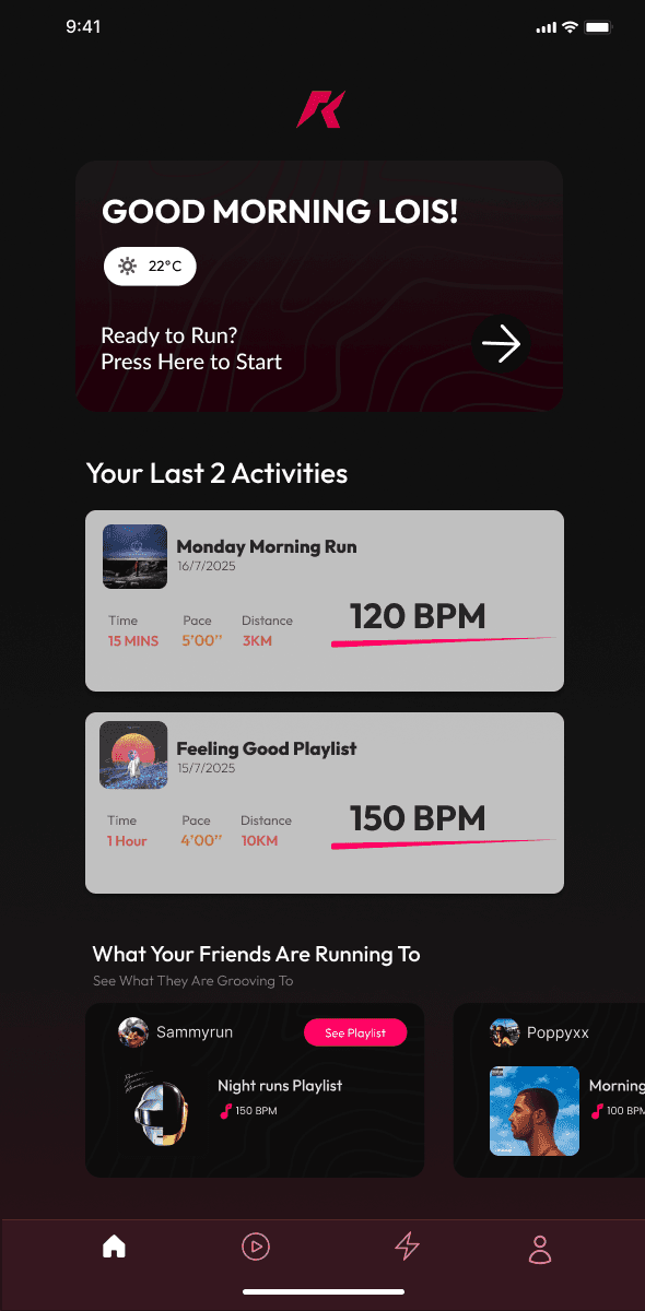 RhythmRun's algorithm creates a fresh playlist for every single run based on what's truly you. Sets your pace, matches your energy, gets you in the zone. So every run feels like it was made for you.